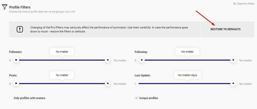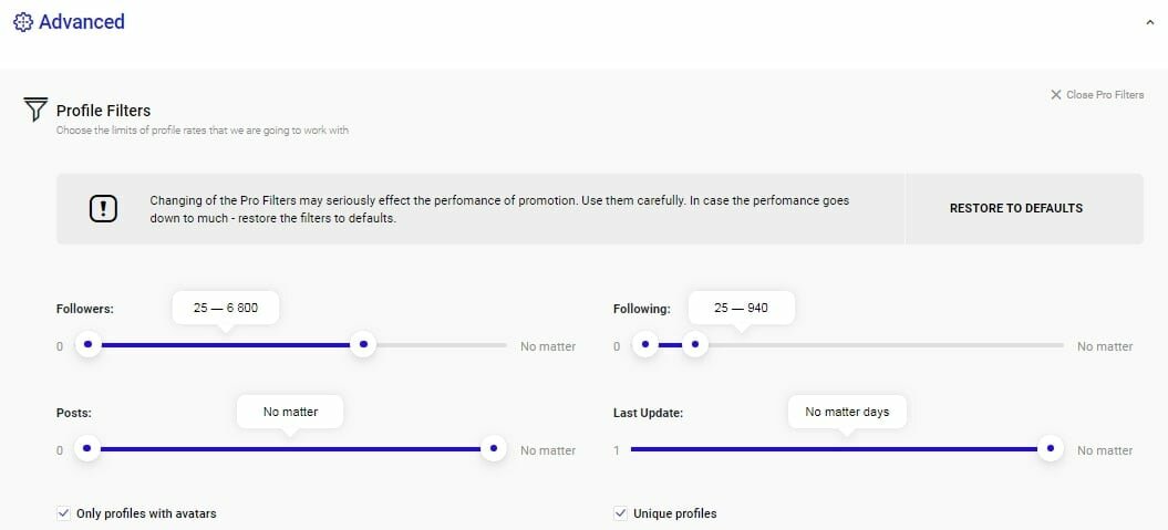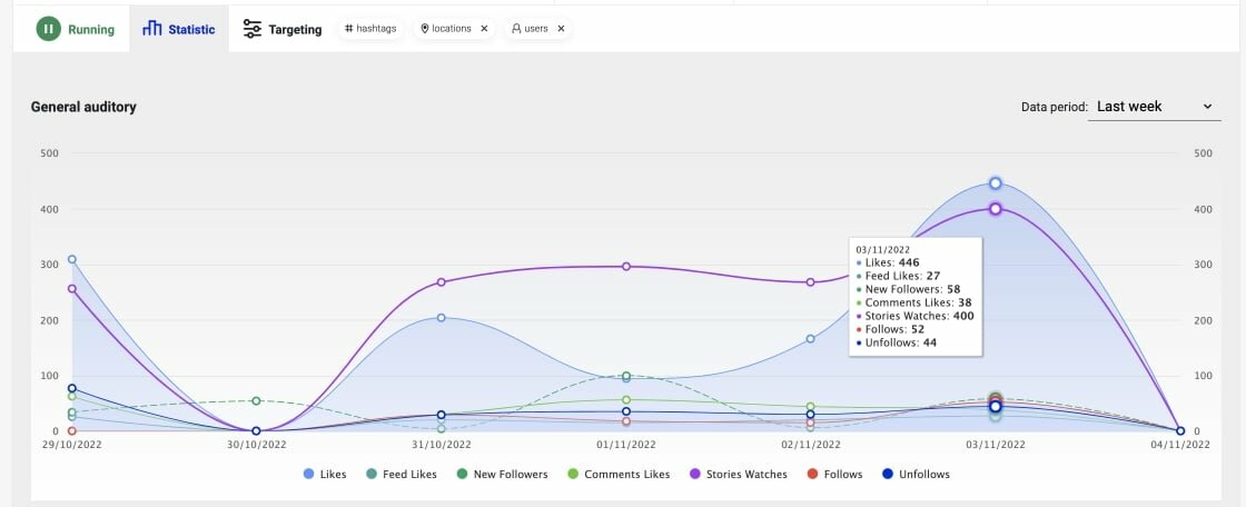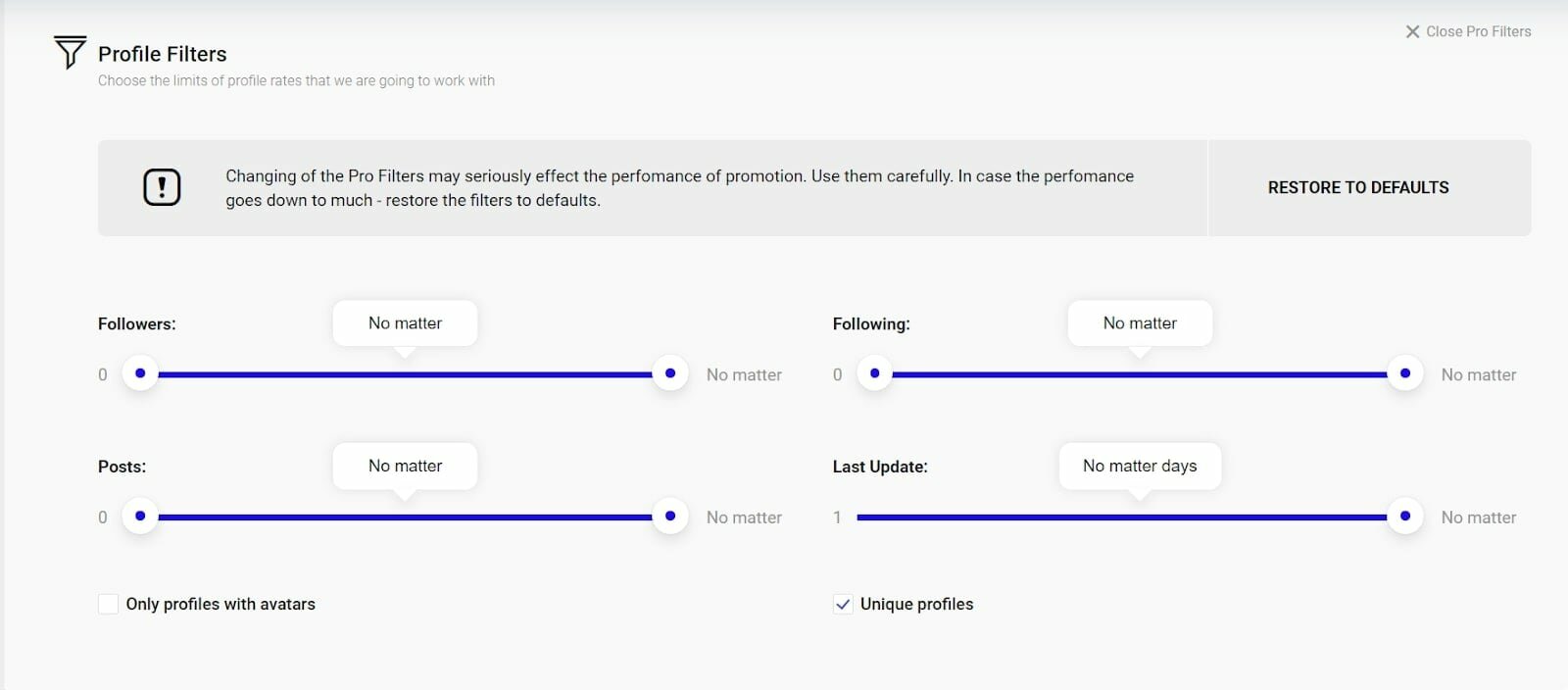 We invented the Safe start for all accounts starting the Promo mode to ensure extra safety. Thanks to the Safe start, our tool will just visit profiles you listed as a target and watch their stories – it will not perform many actions for 48 hours. During the next 7 days, our tool will increase the number of actions from your account gradually.