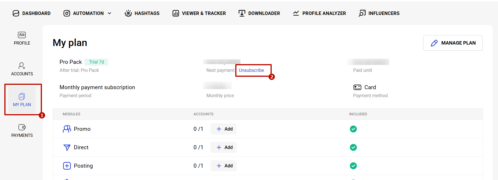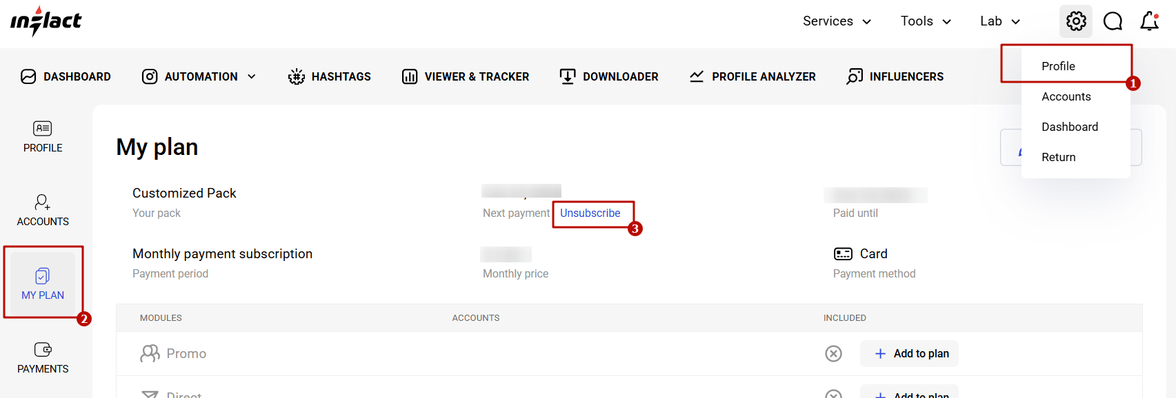- Go to Profile → My Plan → Choose the module you need to pay for.