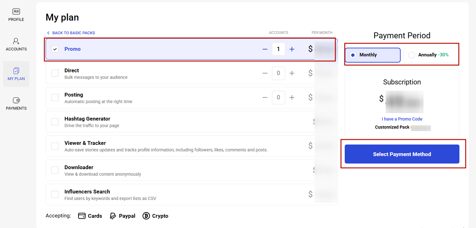 1. Choose the module, number of accounts you added and promotion duration;2. Confirm membership by paying with your Credit Card or via PayPal.