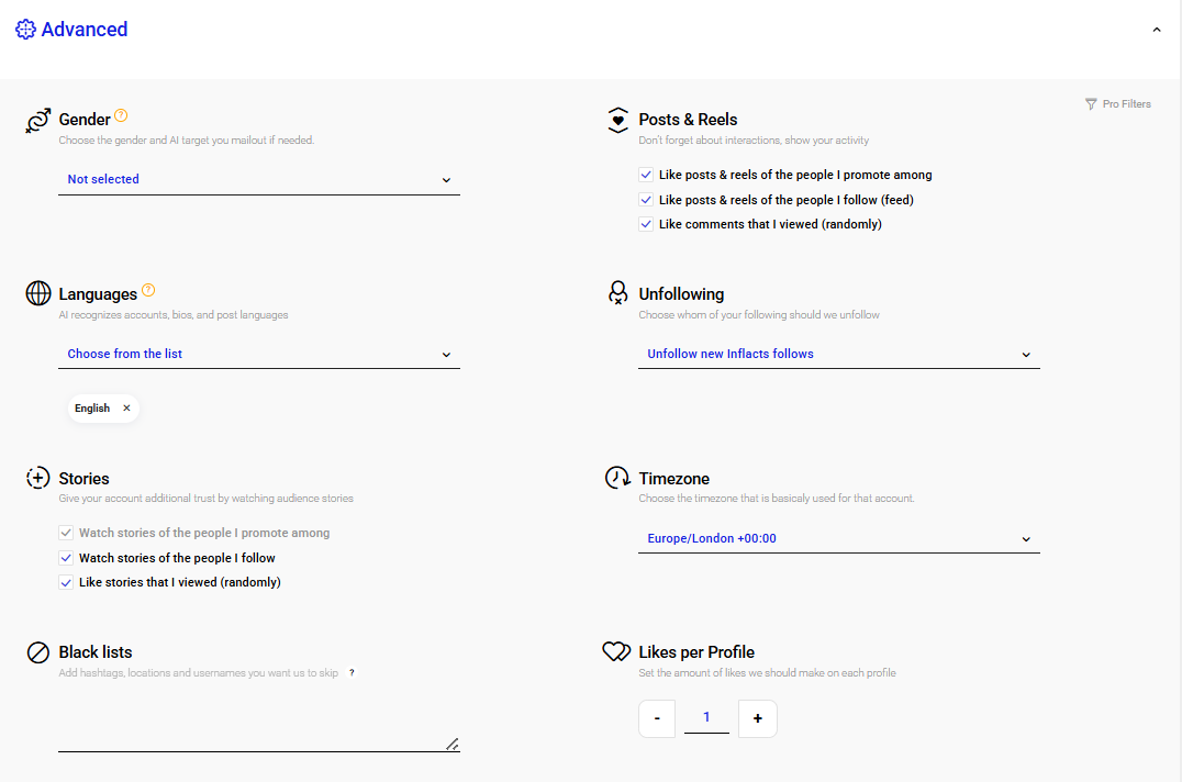 Inflact promotes your account with the help of hashtags, locations and usernames you set up as a targets. We recommend to use use all the promotion strategies and run 10-15 targets at each one.