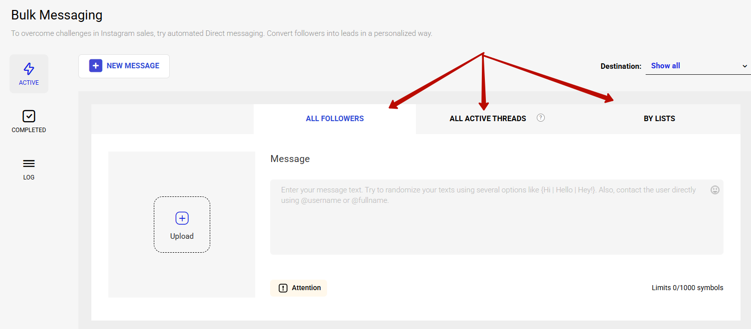 Try to randomize your texts using several options like {Hi | Hello | Hey!}. Also, contact the user directly, using @username. The maximum number of symbols is 1000.