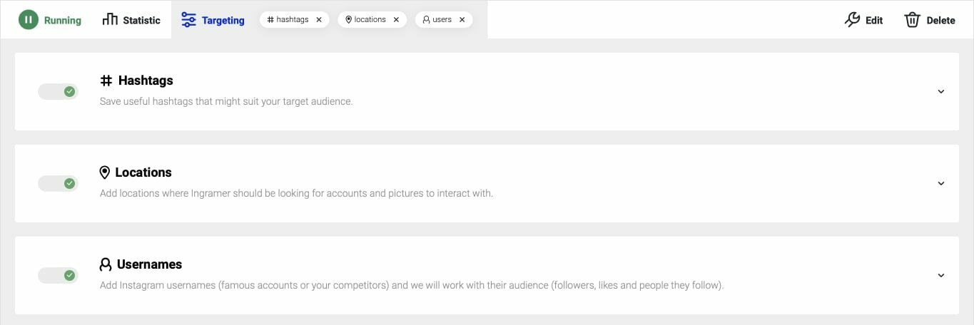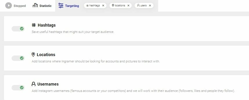- Adjust targeting. Paste usernames, hashtags, locations popular in your niche.