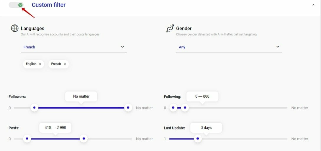 You can choose the languages of accounts, its gender, number of followers, following, posts and last update date.