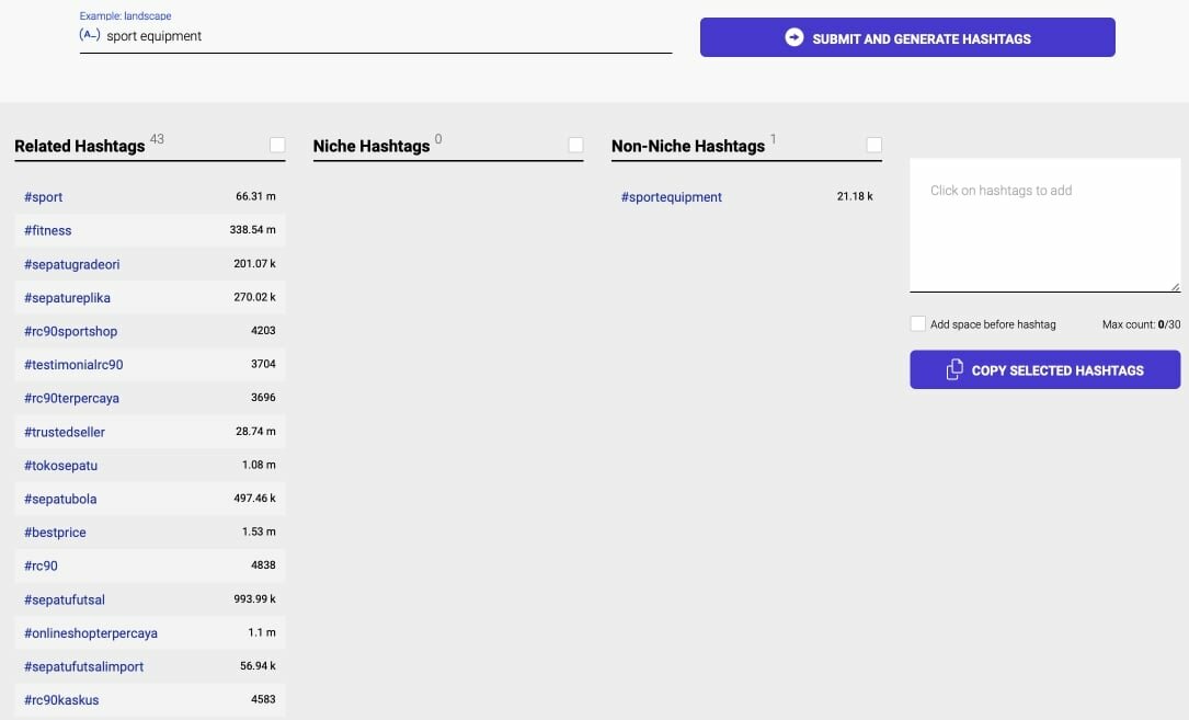 The third way is to use related hashtags. Open our hashtag generator and enter “sport equipment” there