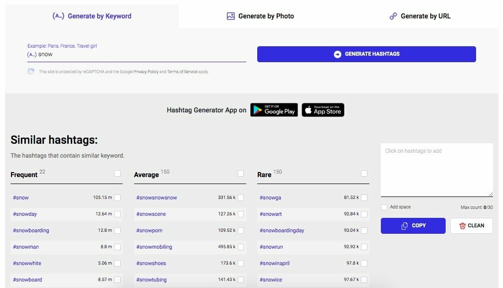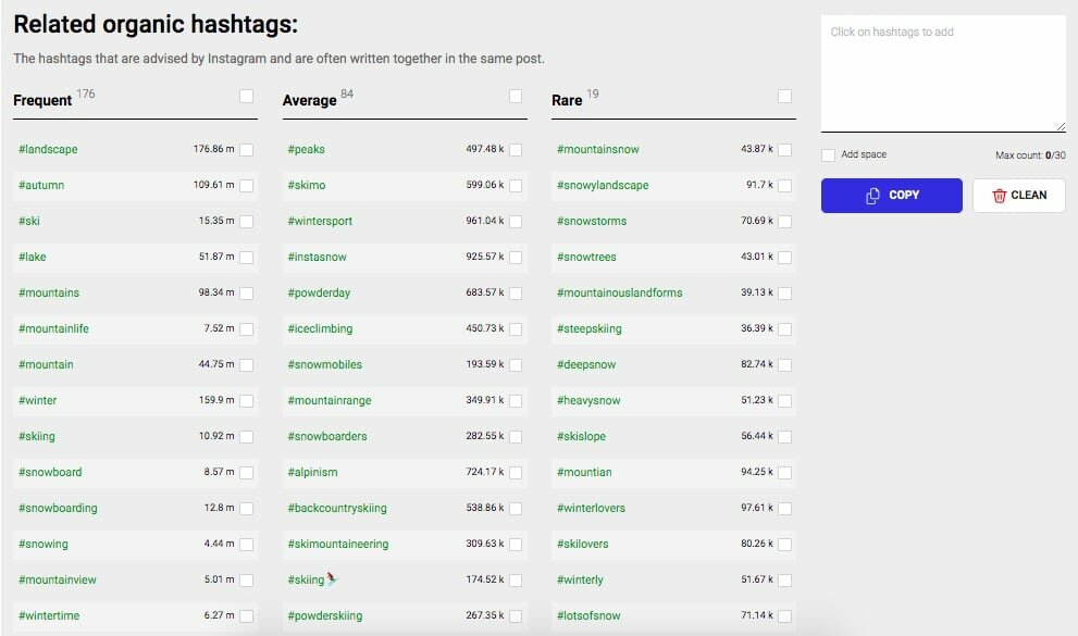 Now you can choose the best hashtags from the Frequent, Average, and Rare columns by clicking them and copying all the selected ones to add them to your photos.