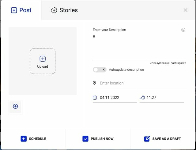 All you have to do is to push “Add content” button, choose Post or Stories, download the photo or video, enter description, location, date and time of posting.
