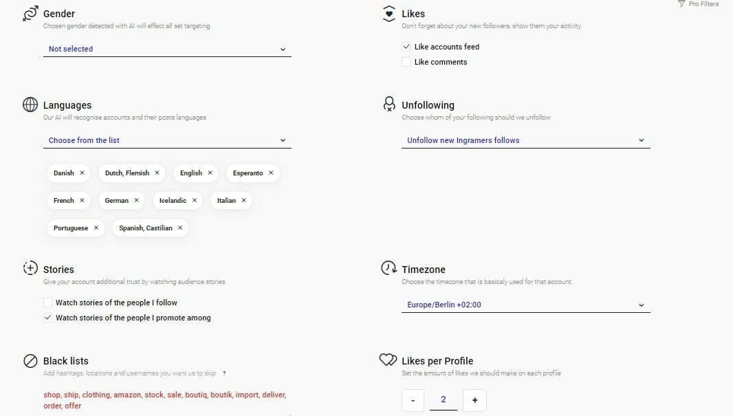 Let’s imagine that you promote make up in your account. Then the best target accounts will be make up stores and other beauty bloggers. You will interact with their followers automatically and they will follow you back if interested. Try to choose those who have about 10k followers and more in order to make your promotion more resultative.