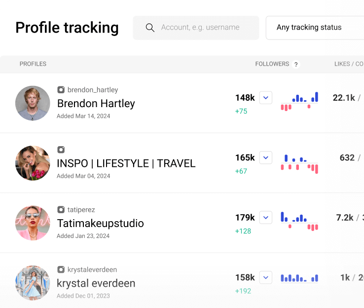 Track followers' retention with links to exact posts or stories. Identify which content is performing strongly and driving subscribes' growth. Reveal which topics go viral and activate the highest number of likes and comments. Track a large number of Instagram accounts and get key profile metrics. Stay one step ahead of your competitors!